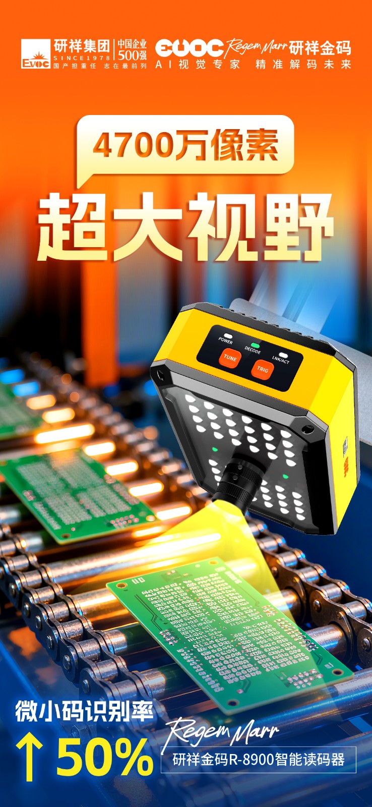 作为行业首款4700万像素的智能读码器,米兰milanR-8900单次识读即可覆盖500+条码,视野范围高达常规读码器的25倍。